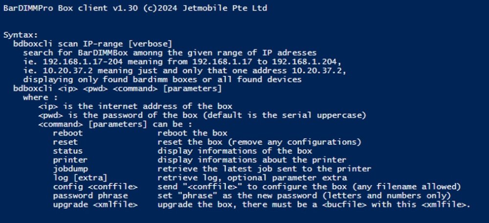 bdboxcli.exe is a command line interface utility to detect and configure the BarDIMM Box.